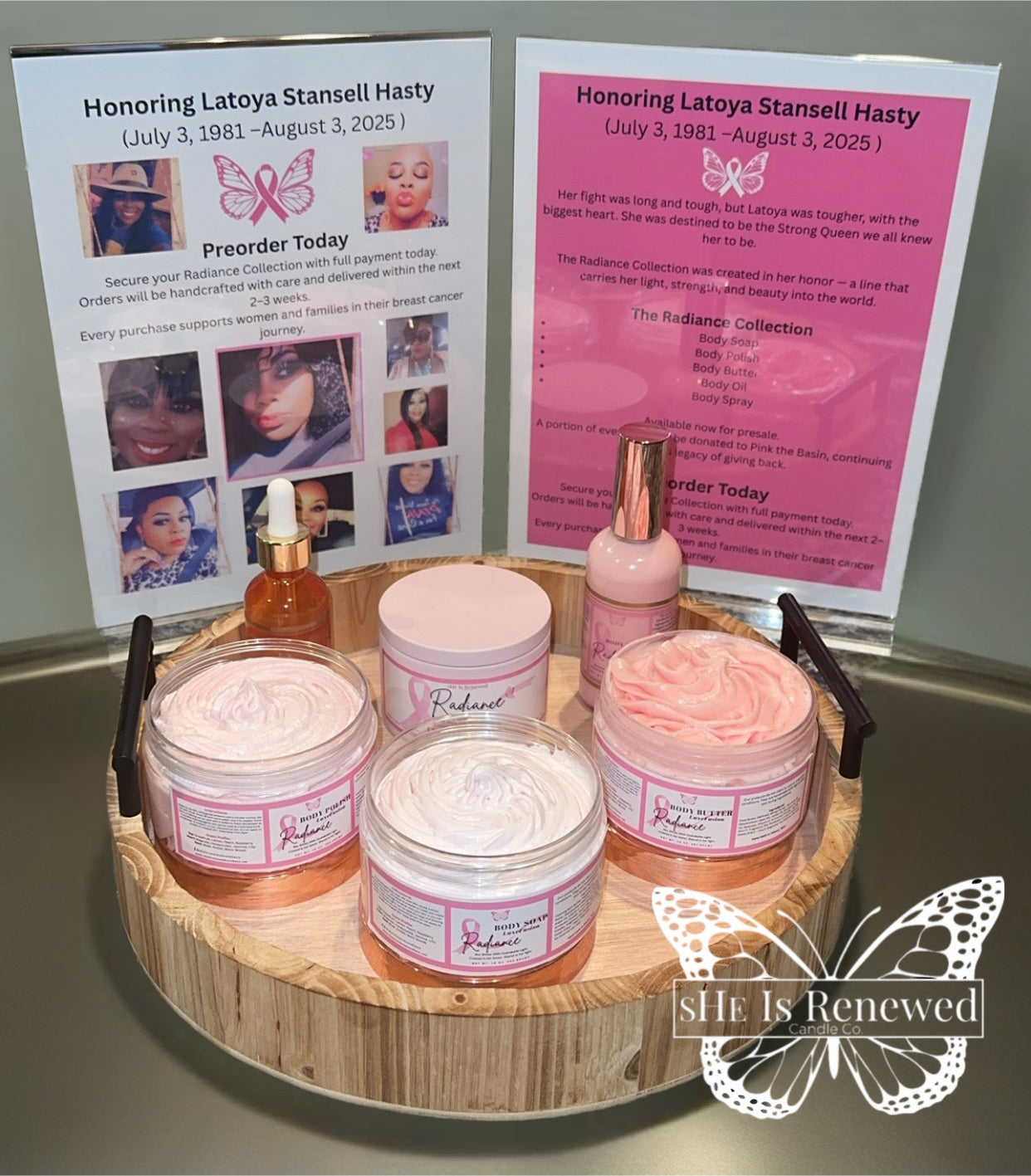 The Radiance Collection was created in memory of Latoya Stansell Hasty — a strong, beautiful, and selfless woman whose light continues to shine. Every product in this collection carries her spirit of strength, grace, and love. A portion of each sale will be donated to Pink the Basin, supporting women and families on their breast cancer journey.